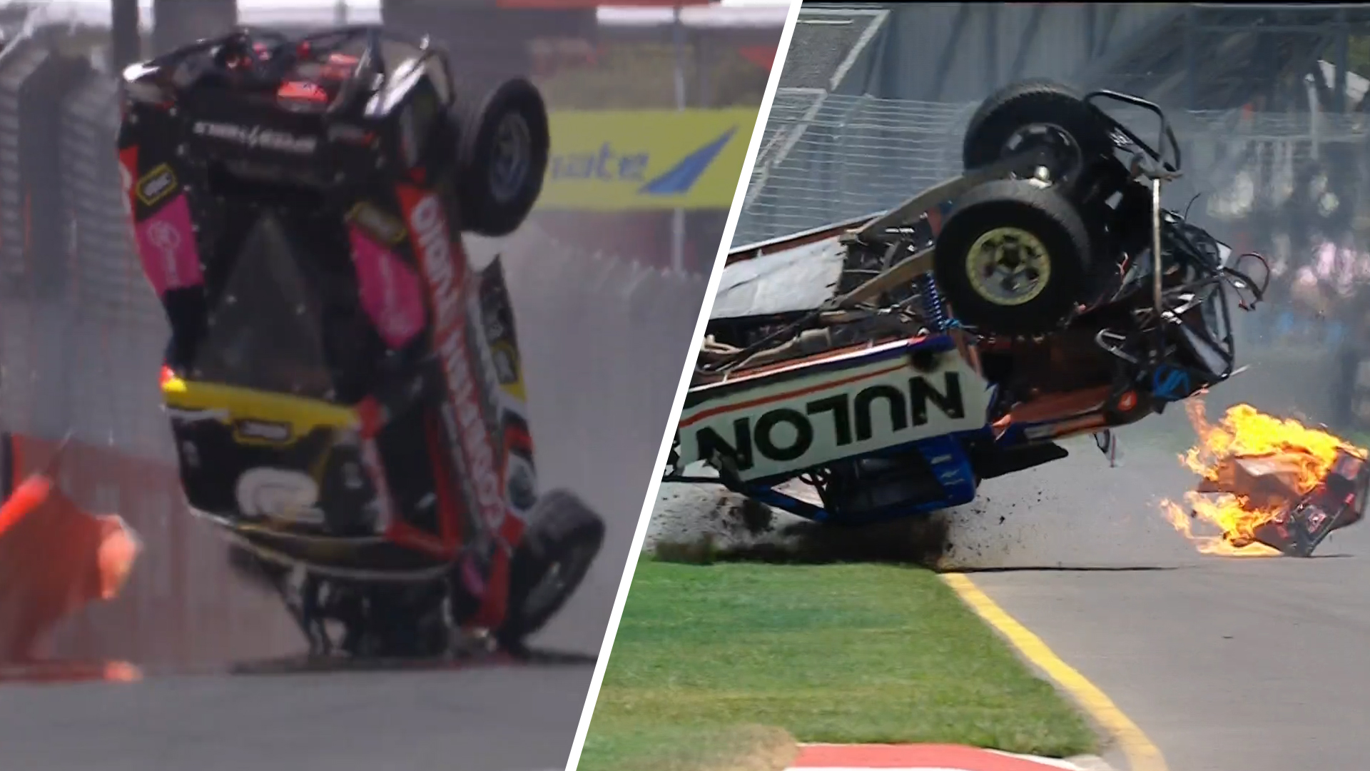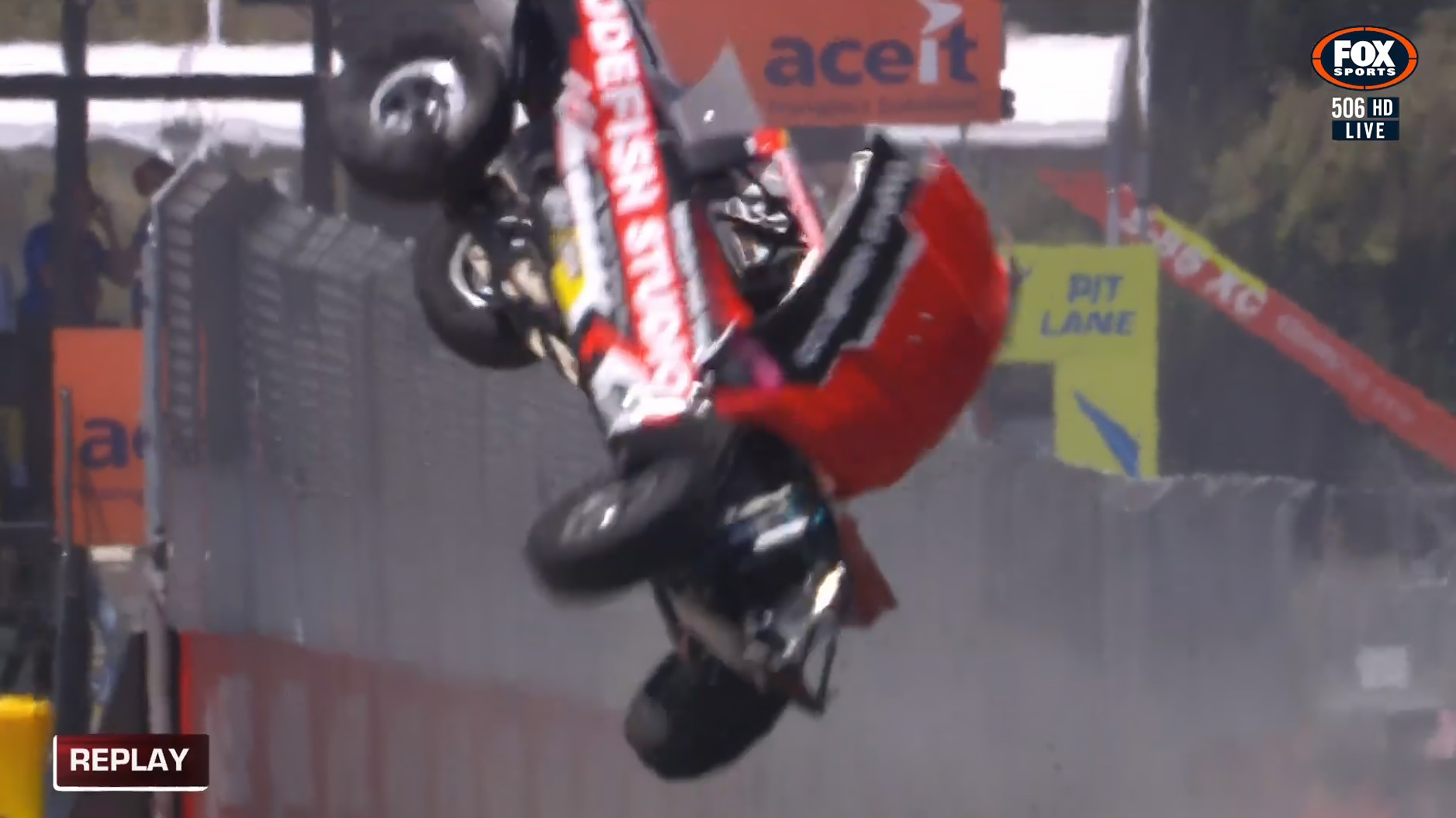 The former Supercars driver was pitched into a spectacular roll after hitting the second jump on the front straight.