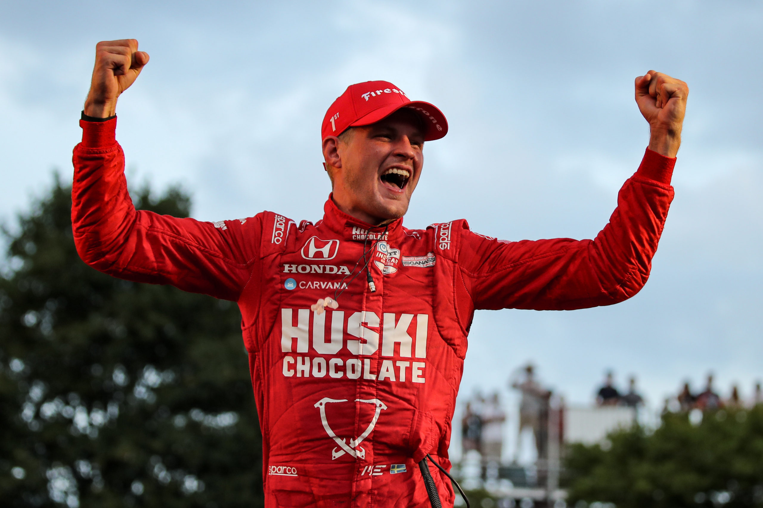 Despite the contact and subsequent penalty, the Swede ultimately led his Kiwi team-mate Scott Dixon to victory in a Chip Ganassi Racing one-two finish.
