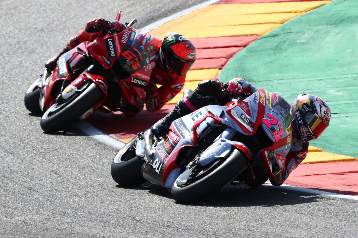 Gresini Racing’s Enea Bastianini has beaten Francesco Bagnaia thanks to a final-lap pass in an Aragon MotoGP race which began with two heart-stopping incidents.