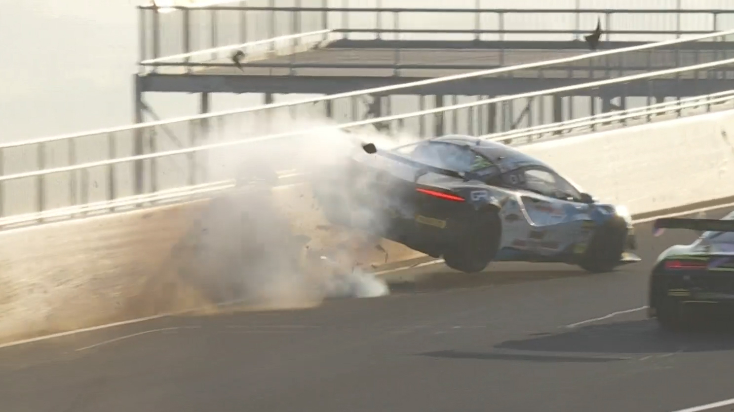 Method Motorsport’s #25 McLaren Artura lost control at McPhillamy Park before speaking across the track and into the path of the #44 Tigani Motorsport Audi R8.