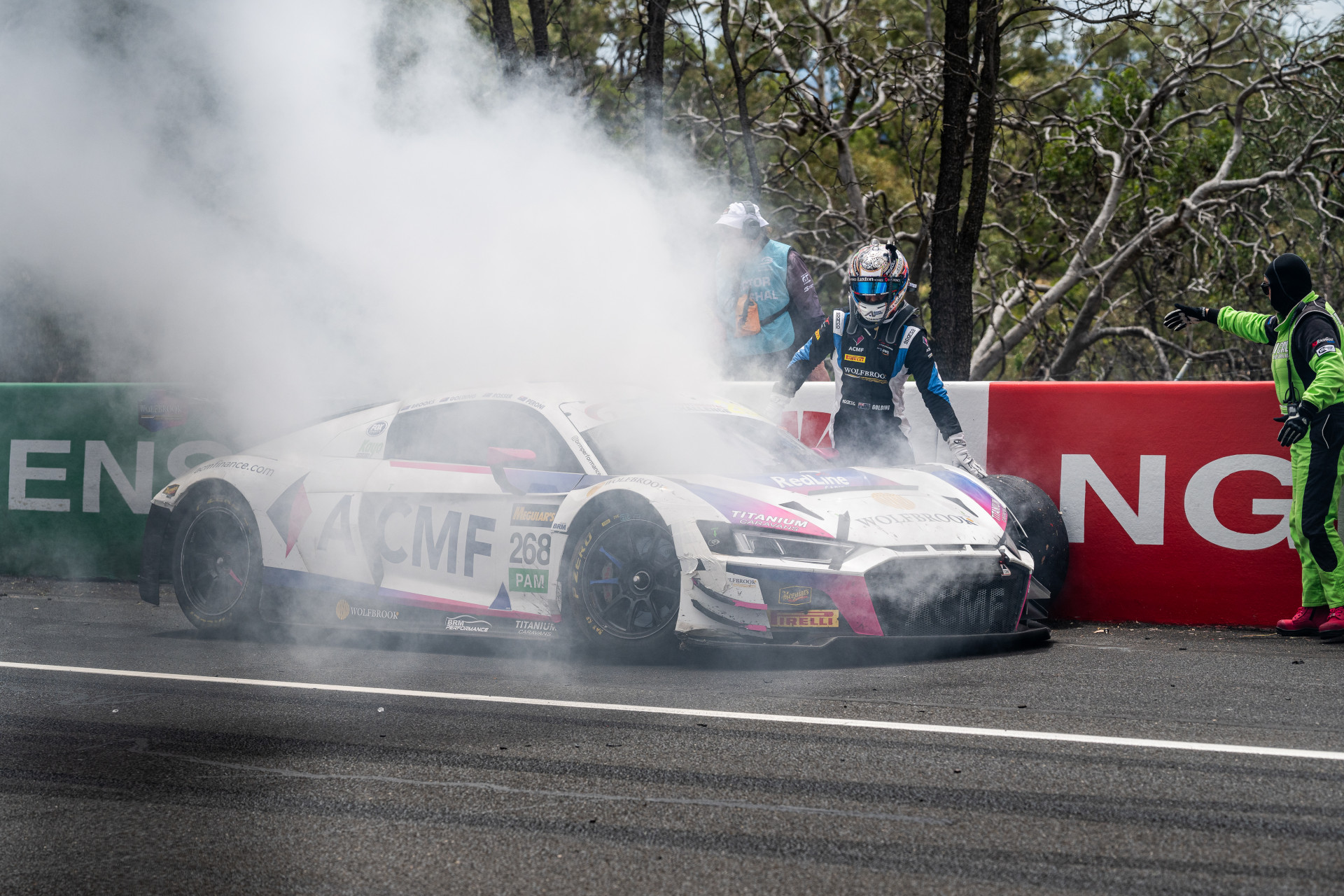 The #268 Team BRM Audi spun and made heavy secondary contact at the exit of the sweeper, bursting into flames as it did so.