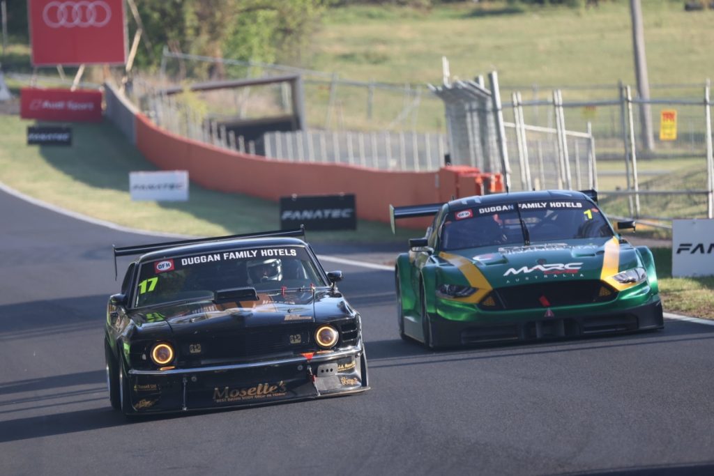 A two-car dice over the concluding laps of the Duggan Family Hotels Combined Sedans Race 2 saw Geoff Taunton (spaceframe GT SS) edge out New Zealander Agus Fogg in his Ford Mustang. However Taunton received a five-second penalty for undercutting the category regulation minimum lap time.