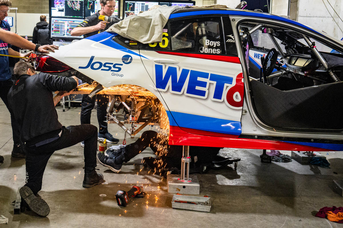 Both chassis rails on Car #96 were bent, with the team completing the repair from the firewall back at 01:30 on Saturday morning.