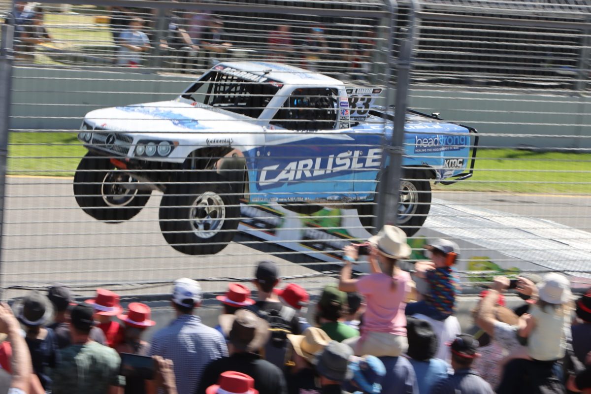 Brabham was hungry to get passed the second-running Mingay, the trucks were nose to tail coming out of Turn 7, and the Carlisle machine out-dragged the Hot Wheels truck into Turn 9.