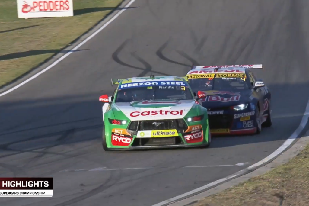 Brown was slapped with a five-second time after he pushed Randle off the track at Turn 7 on Lap 49, although it became moot when he beat Will Davison to third at the chequered flag by more than six seconds and therefore held on to the final podium place.