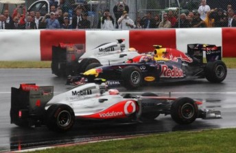 When racing resumed on Lap 8, Button trailed the Safety Car into pitlane for intermediate tyres, with the majority of the front-runners following a lap later.