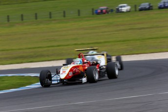 Jon Collins survived a spirited challenge from Ricky Capo to score victory in a first heat of the Australian Formula 3 Championship’s visit to Phillip Island.