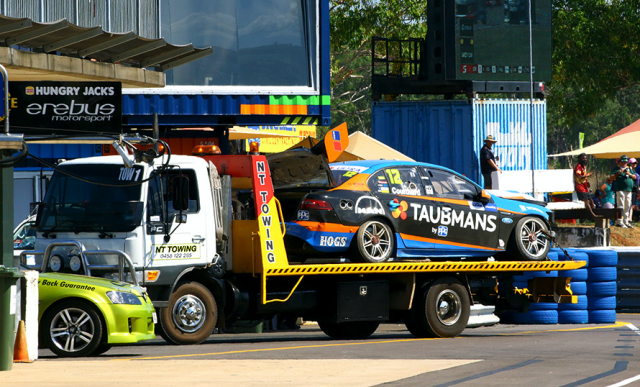 The #12 Taubmans Falcon made head-on contact with the right-side concrete wall at Turn 4 after being caught in a three-wide squeeze on the opening lap.