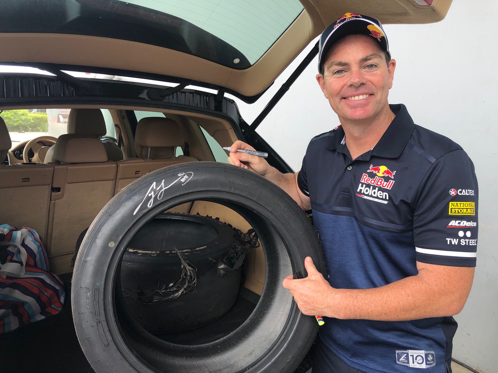 The two rear tyres off Craig Lowndes’ car from his last ever full-time Supercars championship event at Newcastle in 2018 have been offered for individual auction through Lloyds Auctions in Speedcafe.com’s monthly charity event.
