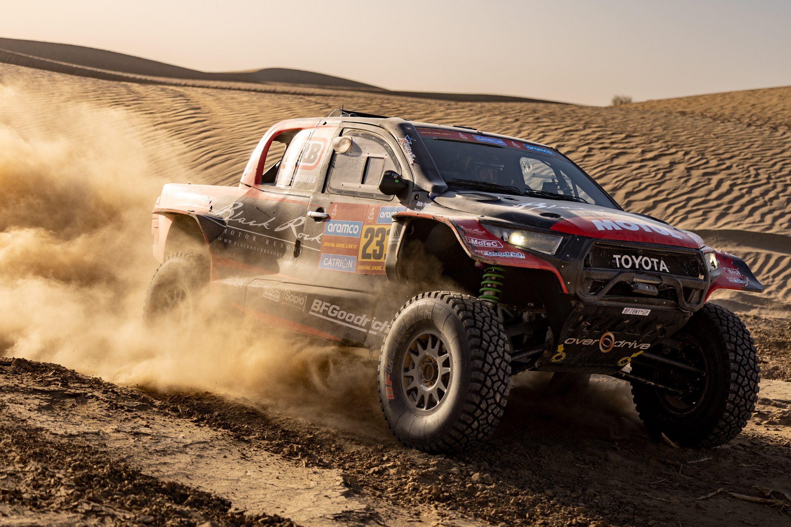 At the end of Stage 2, factory Toyota driver Henk Lategan led the rally in the cars division, four minutes and 45 seconds clear of Price’s Overdrive Racing teammate Yazeed Al-Rajhi.