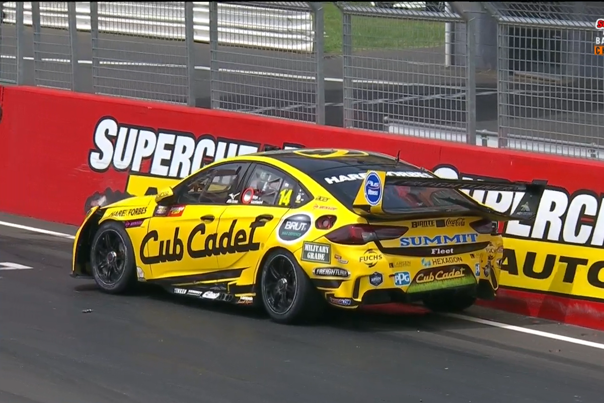 The Brad Jones Racing driver lost control of his #14 Holden ZB Commodore midway through the left-hander, spinning, and clouting the wall on the left-hand side.
