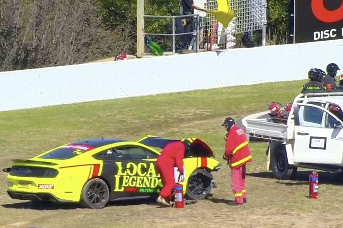 The #7 Mustang of Grant Denyer, Tony Quinn, and Tim Miles is out of the Hi-Tec Oils Bathurst 6 Hour after a crash for the latter at The Chase.