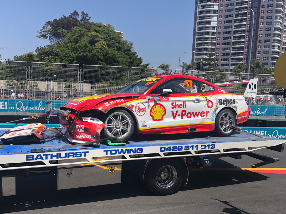 McLaughlin’s #17 Mustang sustained extensive damage after a shocking crash during Armor All Qualifying for Race 27 at the Vodafone Gold Coast 600.