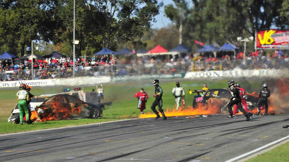 A fireball erupted from the rear of the former’s Commodore, with flames also surrounding the latter’s machine, before both exited their vehicles.