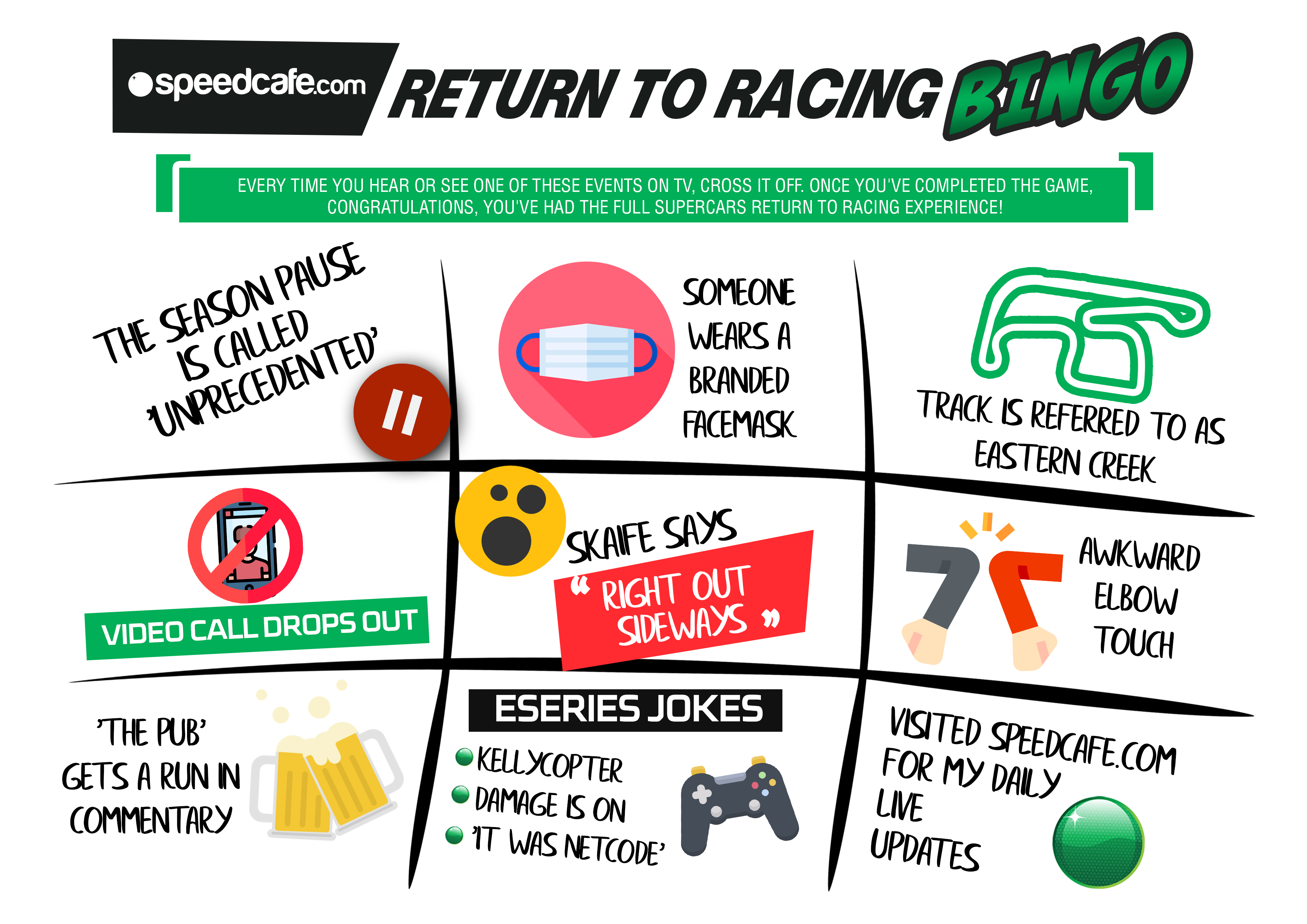 Speedcafe.com has created a special Supercars return to racing themed bingo card for fans to enjoy at home.