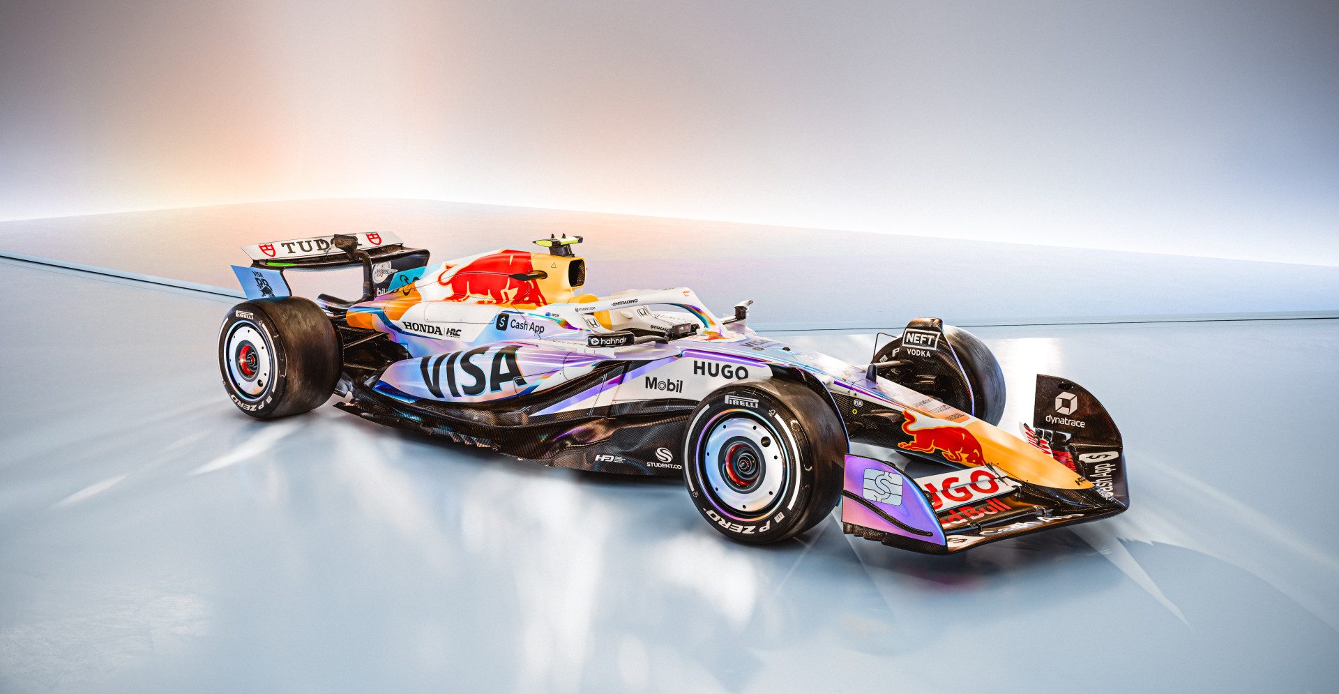 Racing Bulls have opted for a visually bold approach, revealing a holographic scheme inspired by Cash App’s newly released Holo Card.