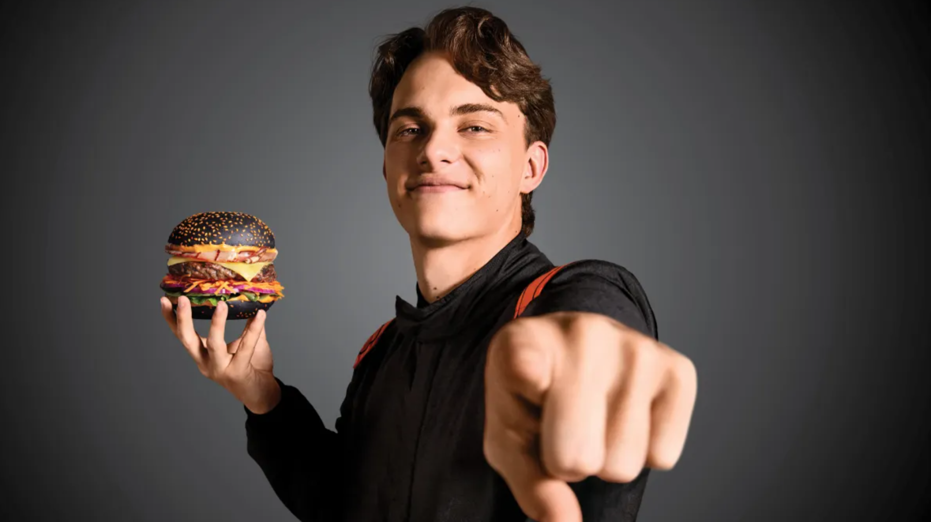 The Oscar Piastri Burger features a Wagyu beef patty on a charcoal bun with papaya sesame seeds, super-charged OP chipotle mayo, crispy bacon, aged cheddar, shredded carrot, cos lettuce, and Spanish onion.