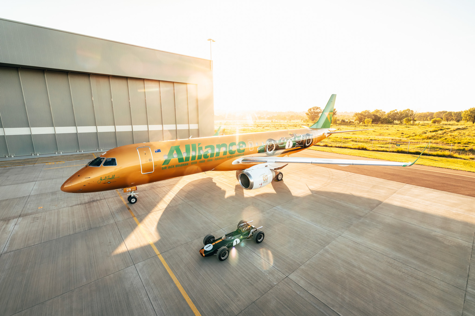 As reported last December when it first touched down in Australia, Alliance Airlines has decked out one of its Embraer E190-100s in Brabham’s green and gold colours to mark the 60th anniversary.