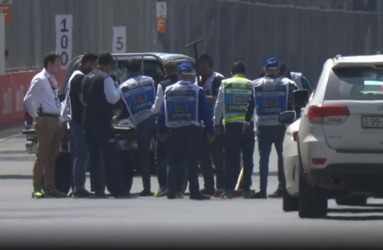Opening practice for this weekend’s Azerbaijan Grand Prix was abandoned when George Russell’s Williams sustained heavy damage when a manhole cover lifted out of the track surface.
