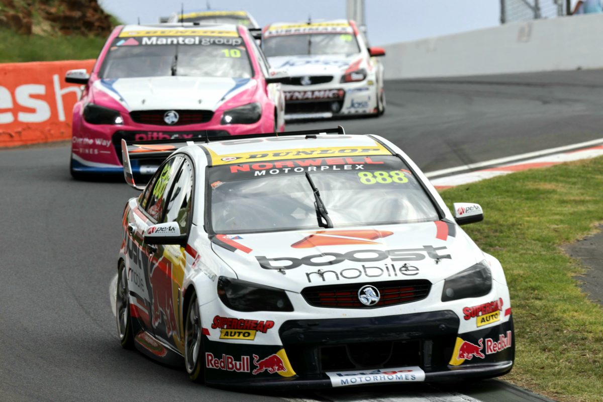 When the real action finally got going, Mouzouris (#10 VF Commodore) blazed away from first position on the grid and took a clear lead into Hell Corner, from Feeney (#888 VF Commodore), Boys (#49 VF Commodore), Jayden Ojeda (#31 MWM Nissan Altima), and Matt McLean (#54 Eggleston VF Commodore).