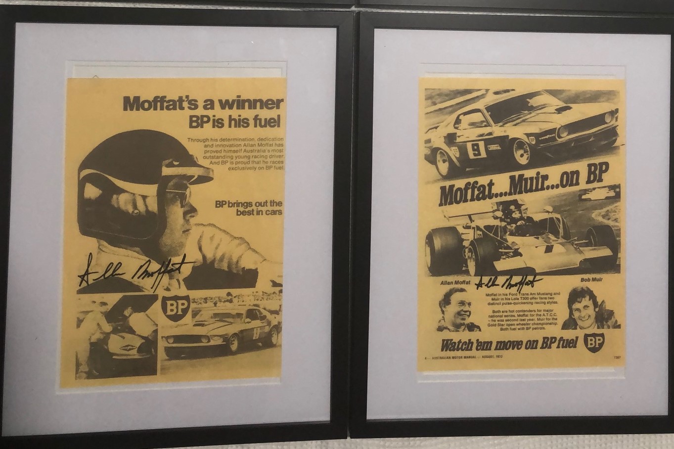 The framed A4 ads from the 1970s highlight a unique period in Australian motorsport and media.