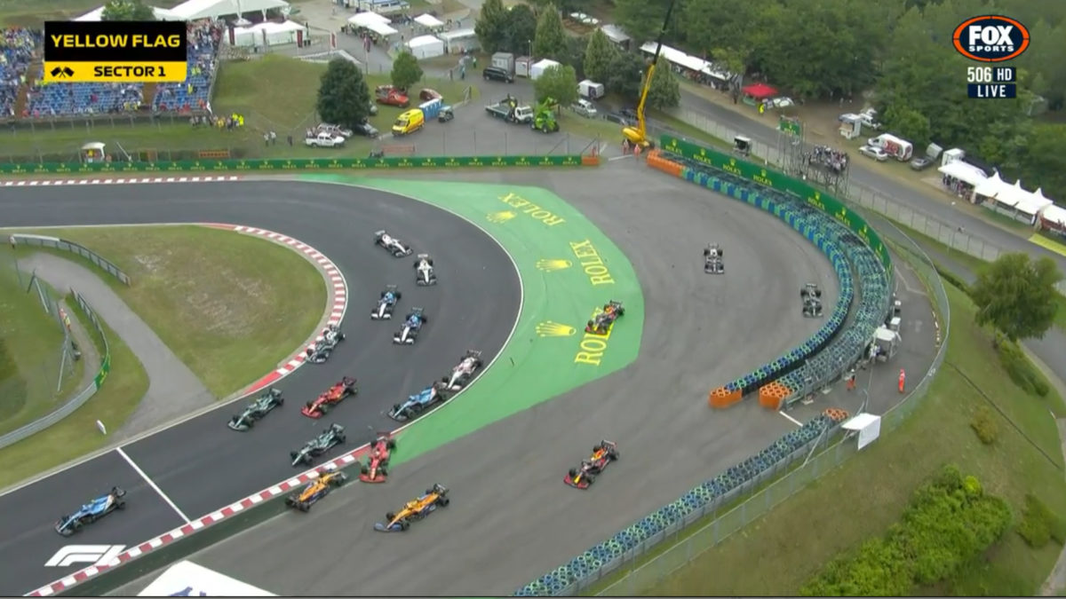 Carnage at the opening corner of the Formula 1 Hungarian Grand Prix has skittled the pack and drawn an early red flag.