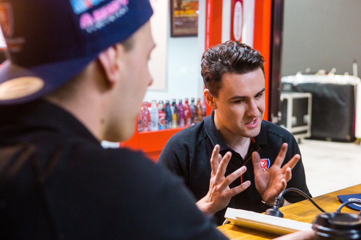 Lando Norris and Max Verstappen on a couch during an F1 press conference