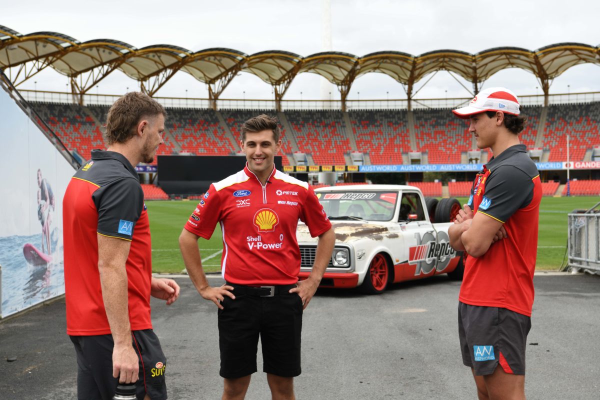 Supercars drivers Anton De Pasquale and Andre Heimgartner spent Thursday morning at Metricon Stadium, warming up for next week’s Boost Mobile Gold Coast 500 by kicking footies with Gold Coast Suns AFL players Nick Holman and Wil Powell.