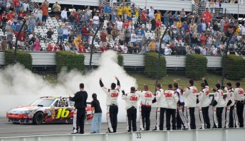 Carl Edwards came home third, series points leader Kevin Harvick fourth and Denny Hamlin fifth. Sixth-place finisher Jeff Gordon saw his bid for his first victory since April 2009 disappear when a four-tyre stop under caution on lap 167 of 200 left him mired in traffic behind cars that took two tires or fuel only.