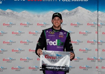 Denny Hamlin has claimed pole for the season-ending NASCAR race at Homestead-Miami Speedway, while team-mate Kyle Busch was the best qualifier in the Final 4 contenders for the championship.