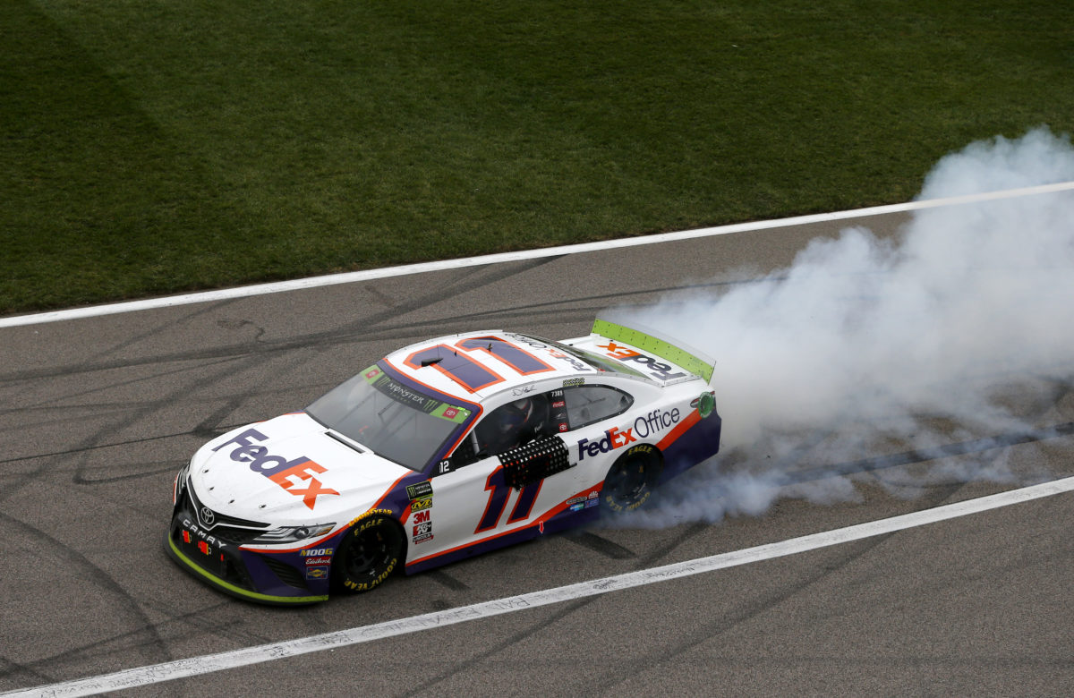 Denny Hamlin brushed off an attack from Chase Elliott to win in double overtime during the final race of the NASCAR Playoffs Round of 12 at Kansas Speedway.