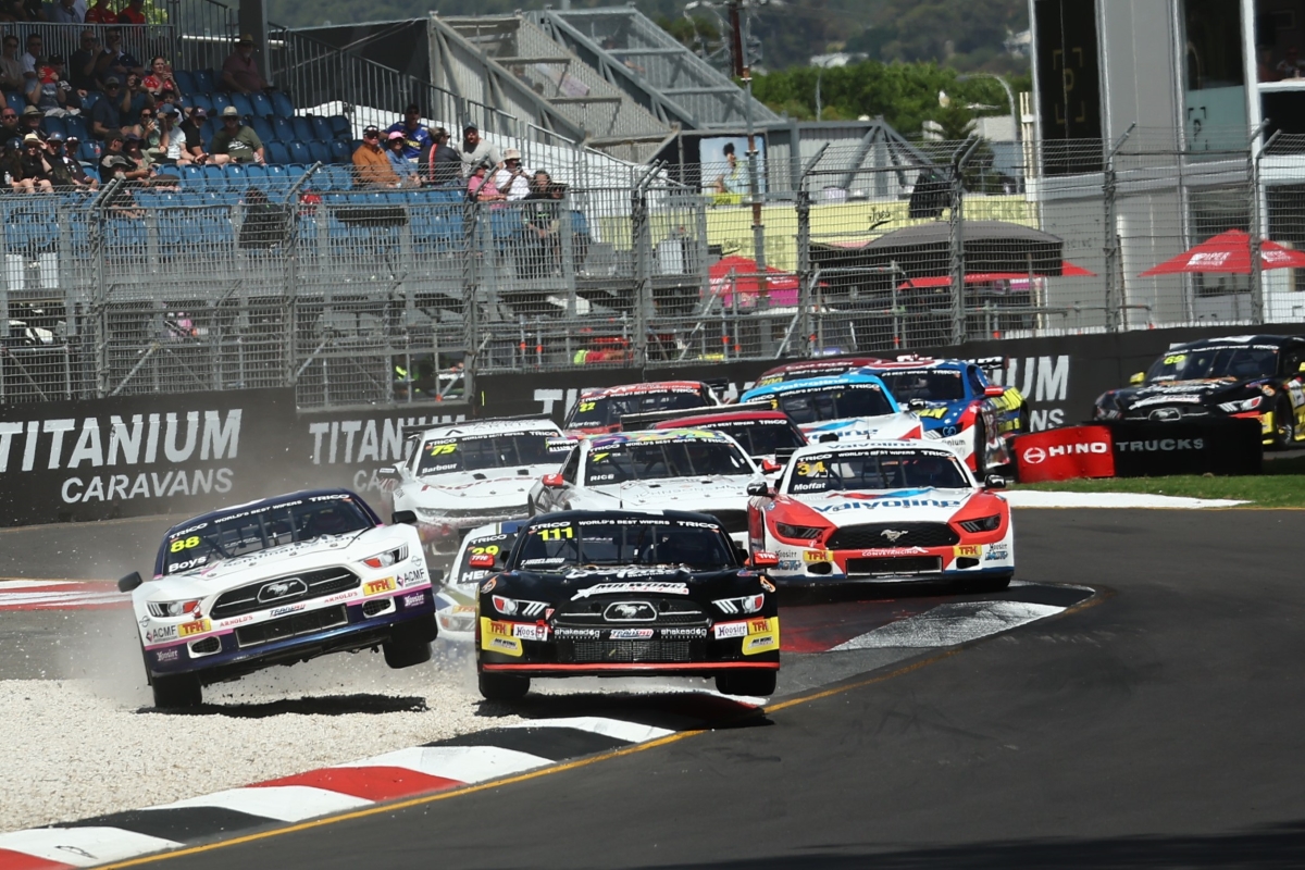 Hazelwood had been the fastest qualifier ahead of Jordan Boys (Mustang). Together they charged to the Senna Chicane side-by-side. Both leaped over the kerbs and while Hazelwood continued in front, Boys spun. The following Nathan Herne (Mustang) had nowhere to go, checked up and tapped Boys.