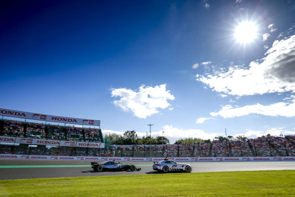 Lewis Hamilton tucked up behind the Safety Car at Suzuka