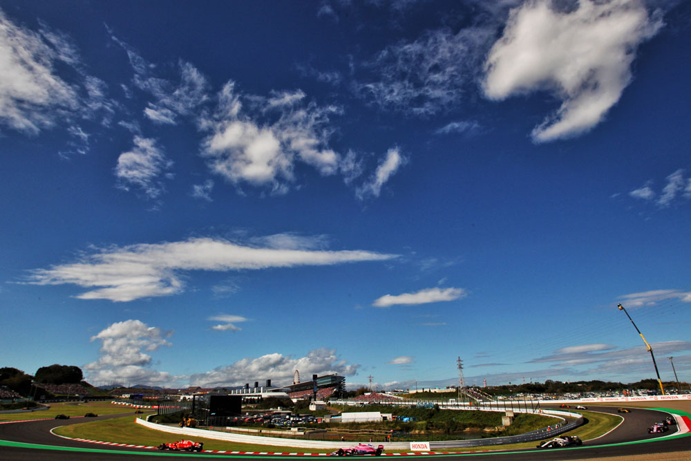 The F1 field streams through the opening corner of at Suzuka
