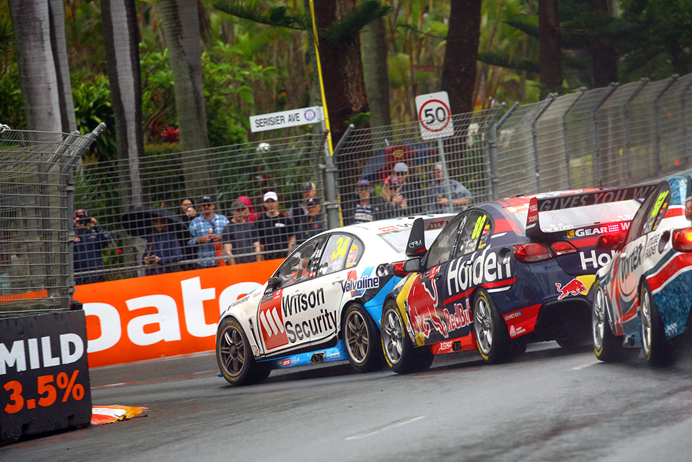 James Moffat, Jamie Whincup, and Craig Lowndes run nose-to-tail through Turn 12 during Race 21 at the Vodafone Gold Coast 600