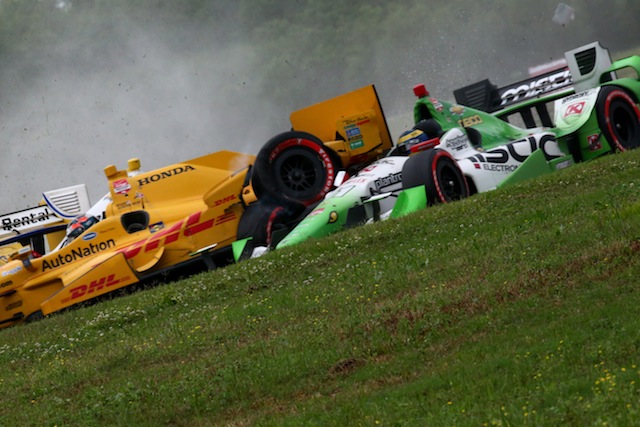 The ensuing drama saw Penske driver Simon Pagenaud pushed off the track before he slewed out of control and came back into the path of Hunter-Reay whose Andretti Autosport car slammed into Sebastien Bourdais.