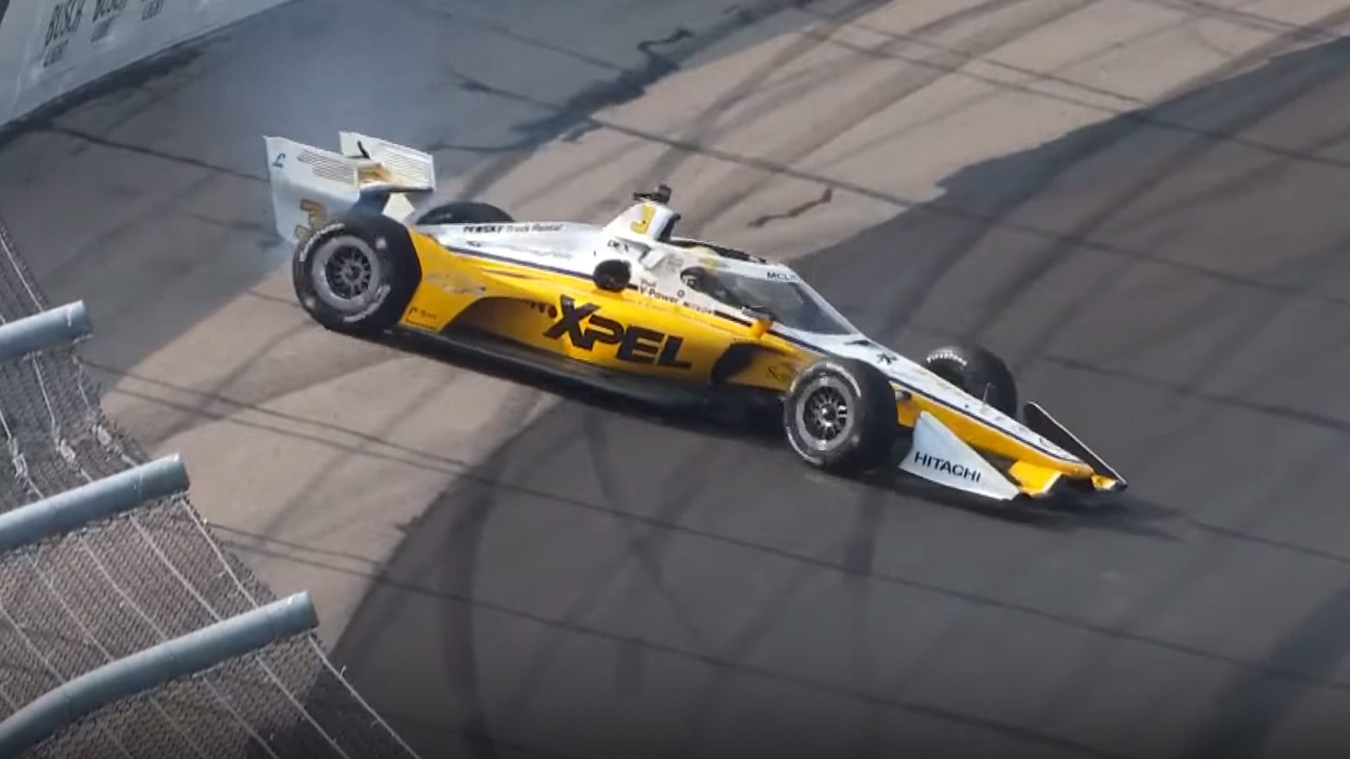 His car made vicious contact with the outside wall, damaging the right rear and right front whilst also plucking the wing off.