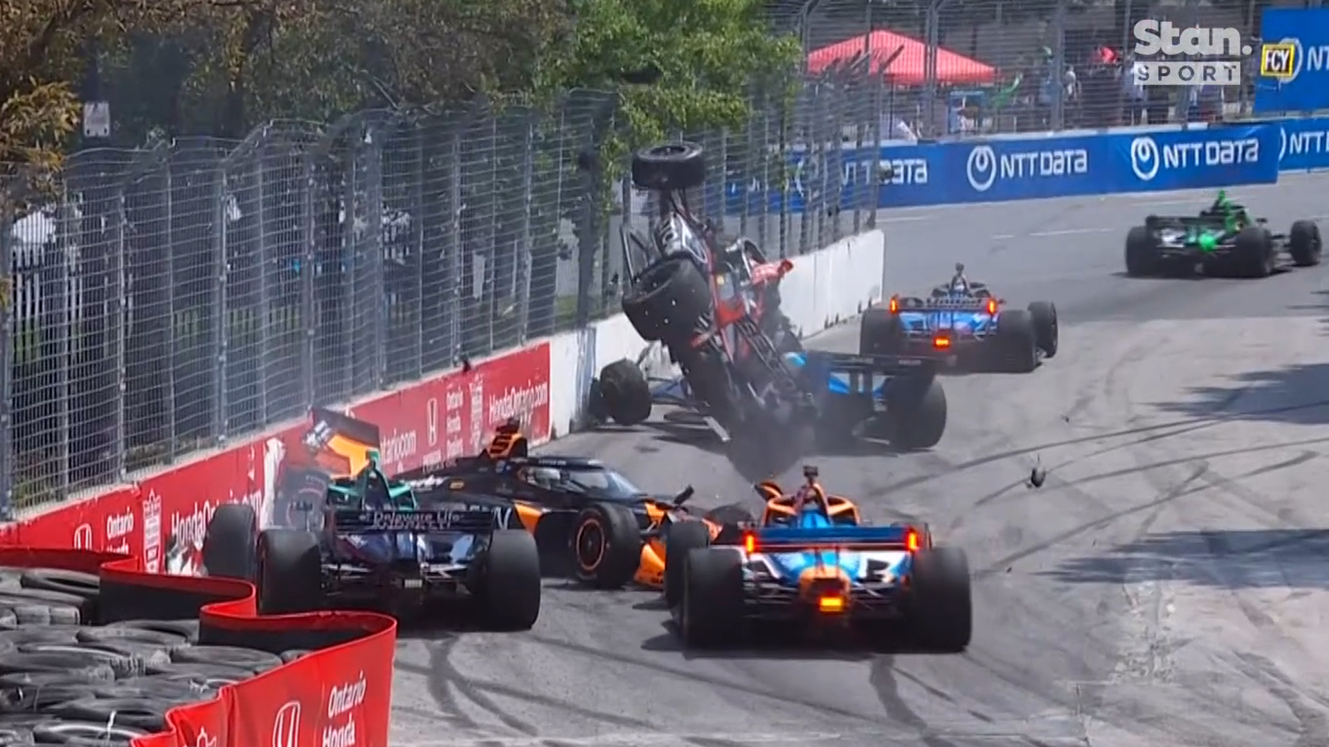 IndyCar had its second airborne crash in a week after AJ Foyt Racing’s Santino Ferrucci launched his car off the nose of McLaren driver Pato O’Ward in Toronto.