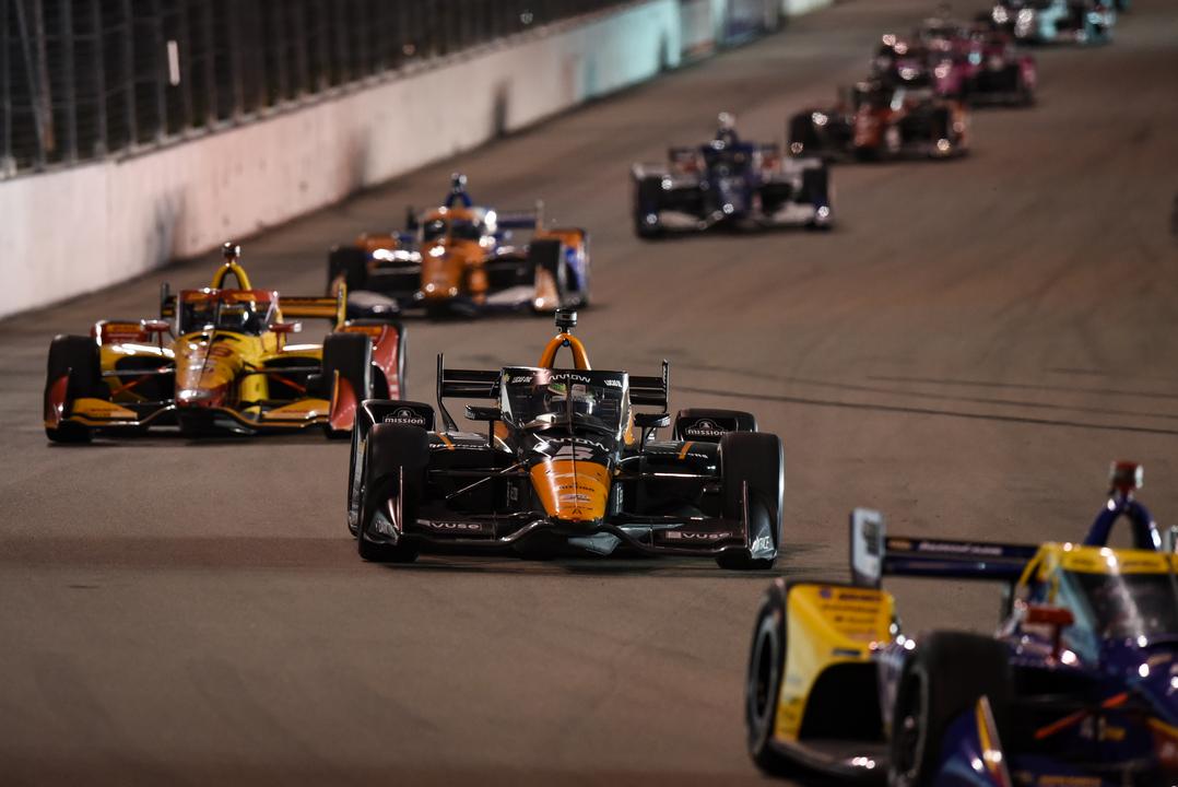 In action are AJ Foyt Racing’s Dalton Kellett and Kyle Kirkwood; Dale Coyne Racing with HMD’s David Malukas; Andretti Steinbrenner Autosport’s Devlin DeFrancesco, Juncos Hollinger Racing’s Callum Ilott, Rahal Letterman Lanigan Racing’s Christian Lundgaard.