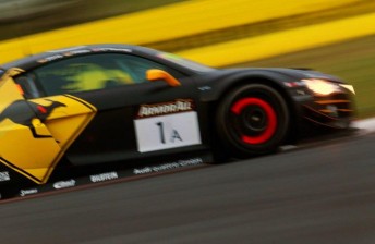 The #1 Team Pheonix Audi of Christopher Mies heads the field at the halfway mark of the 2012 Armor All Bathurst 12 Hour on a grey Mount Panorama.