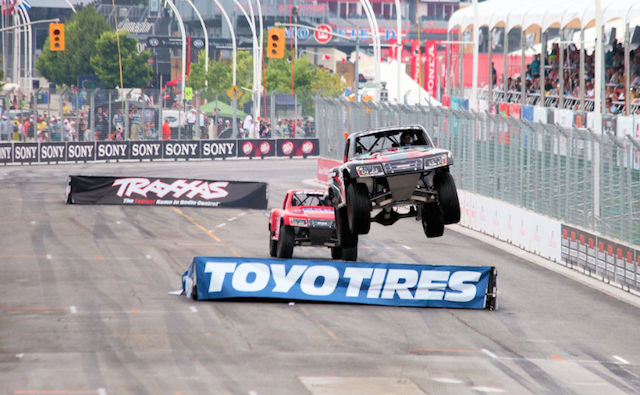 The category’s purpose-built pick-up trucks feature 600bhp V8 engines and compete on street circuits fitted with temporary jumps to add to the spectacle.