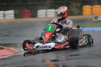 Reigning KZ2 Champion Joey Hanssen set the pace during a rain-soaked day of practice at Round Two of the Castrol EDGE CIK Stars of Karting Championship in Adelaide.