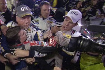 Words between the two quickly escalated and even Harvick was seen to push Keselowski from behind as a brawl erupted. Both drivers sported battle scares on their cars and faces in the process.