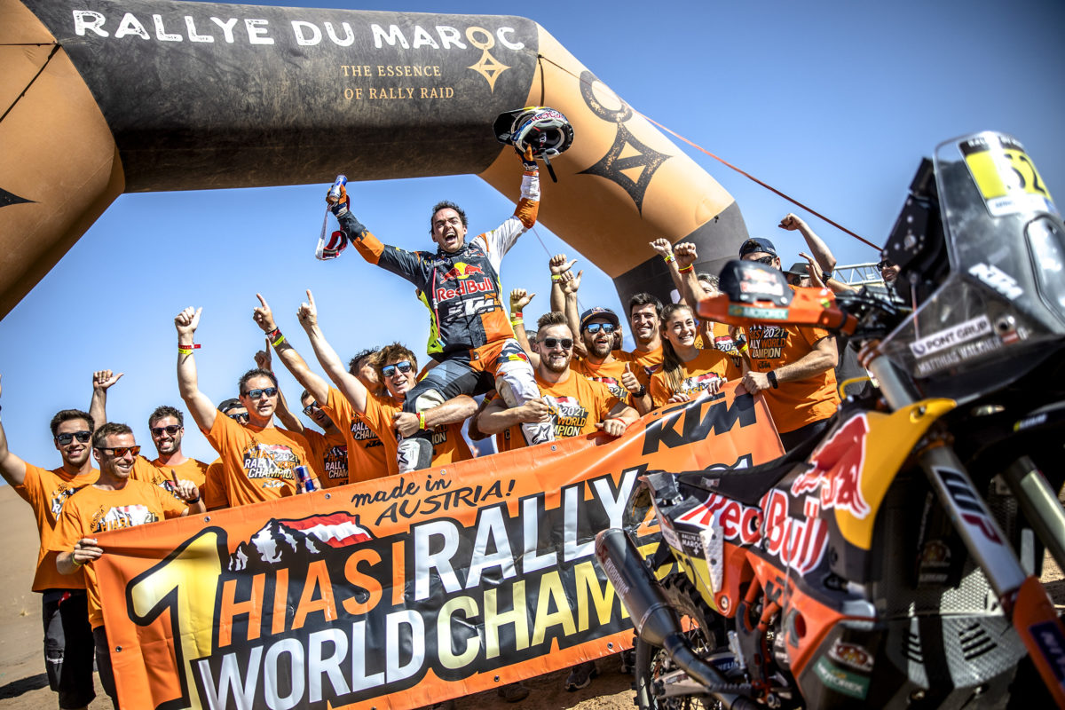 Red Bull KTM Factory Racing has celebrated a third straight FIM Cross-Country Rallies World Championship title after Matthias Walkner finished second in Rallye du Maroc.