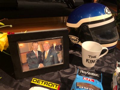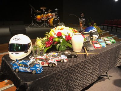 A table was positioned at the front of the church with memorabilia from Brabeck’s life including drum sticks, a photo with former Australian Prime Minister John Howard, as well as an array of models of race cars he was involved with as a sponsor or a team owner.