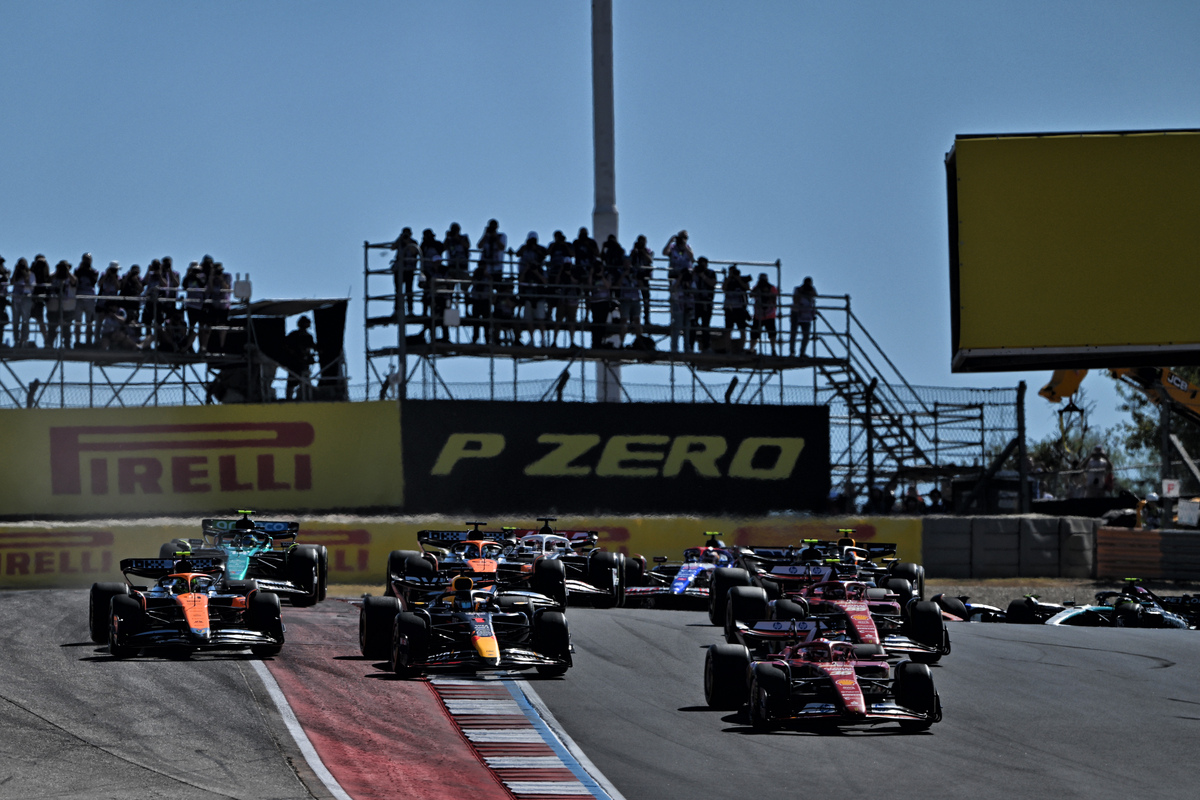 Norris tried to defend the inside line but Verstappen kept coming, and the pair drifted wide, with Leclerc sneaking through into the lead, while Verstappen passed Norris, who also dropped behind Sainz.