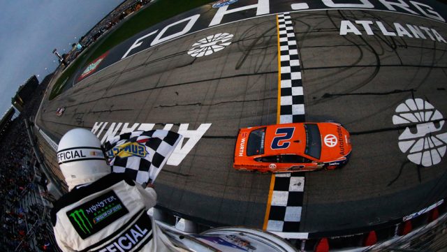 Brad Keselowski has overcome a loose wheel nut and a dominant Kevin Harvick to win the Fold of Honor 500 in Atlanta.