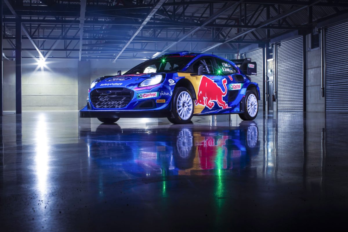 Highlighted by pink and blue elements, the Puma Rally1 features prominent Ford and Red Bull branding.