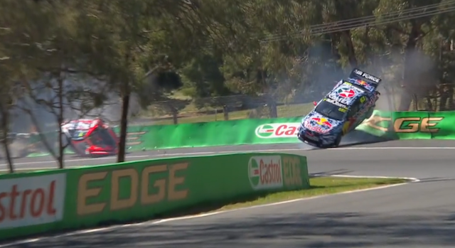 The contact with Luff also sent Lowndes spinning rear-on into the tyre barrier, which spectacularly shot the back of the Red Bull car into the air before coming to rest.