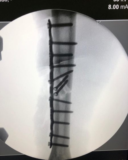Among them are a broken limb prior to surgery and a limb with a plate and 12 screws fixed to it.
